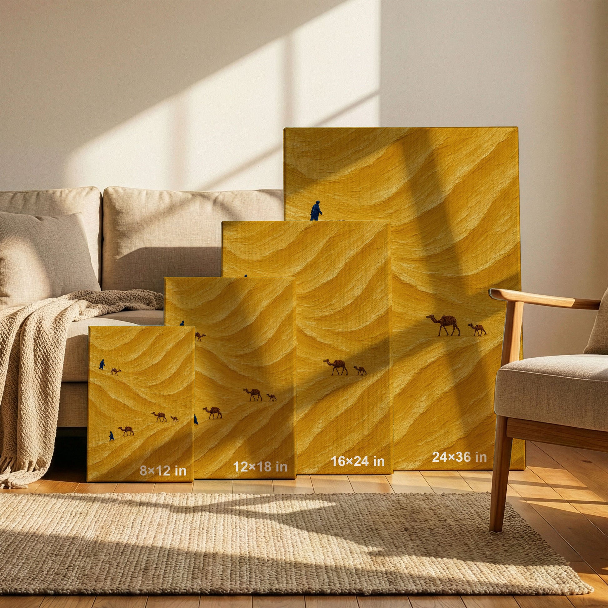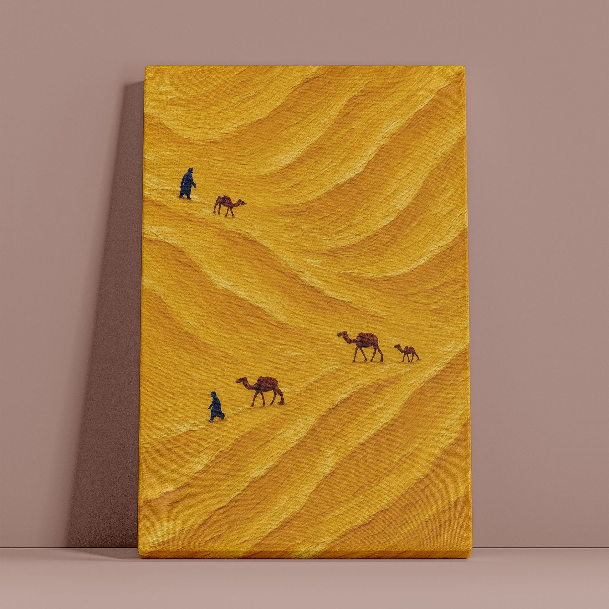 The textured yellow landscape feels sculpted by wind and silence, while tiny figures and camels travel calmly across its surface.