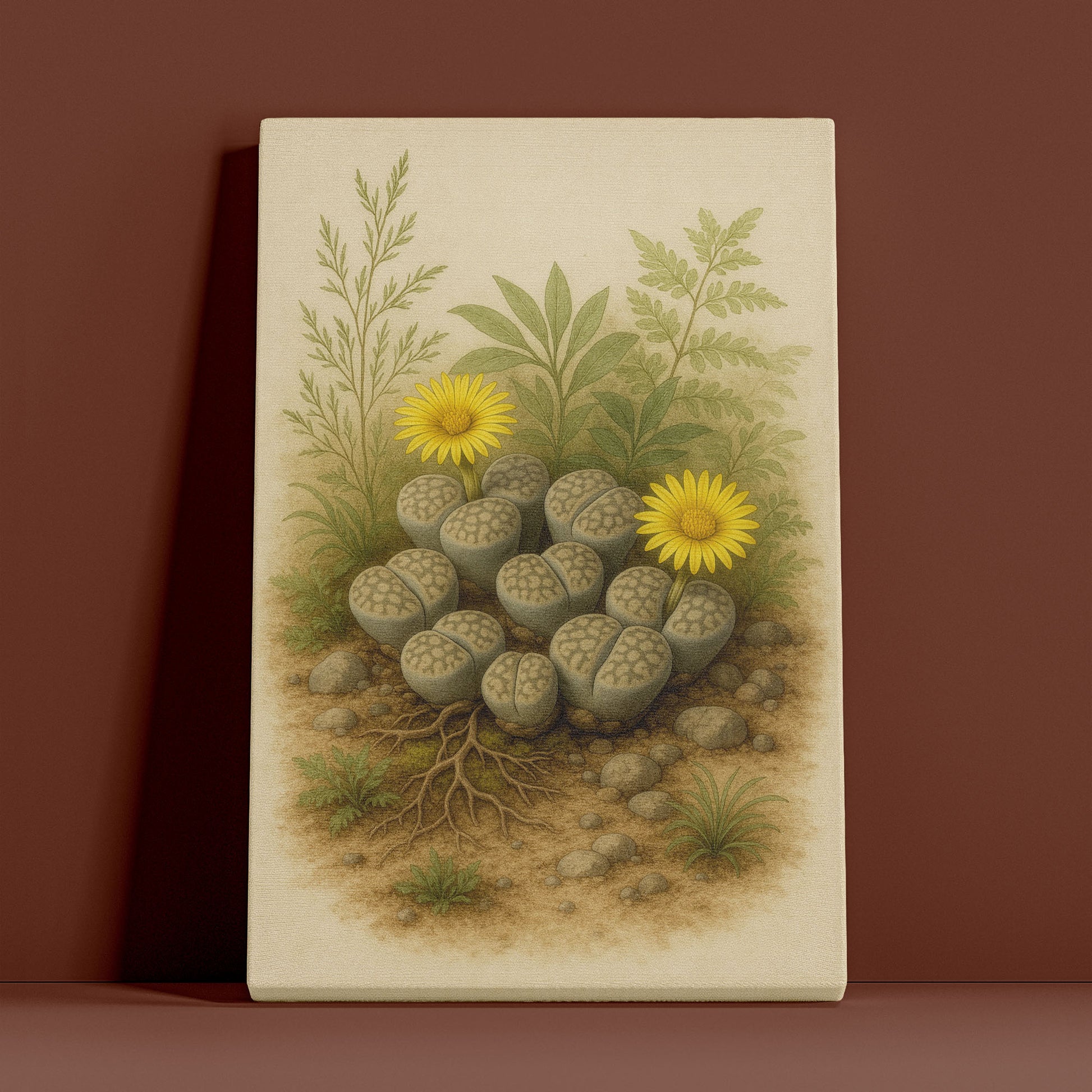 This artwork highlights lithops in bloom, where delicate yellow flowers emerge from stone-like forms. The contrast between softness and structure creates a serene visual balance, perfect for nature-inspired interiors and minimalist decor.