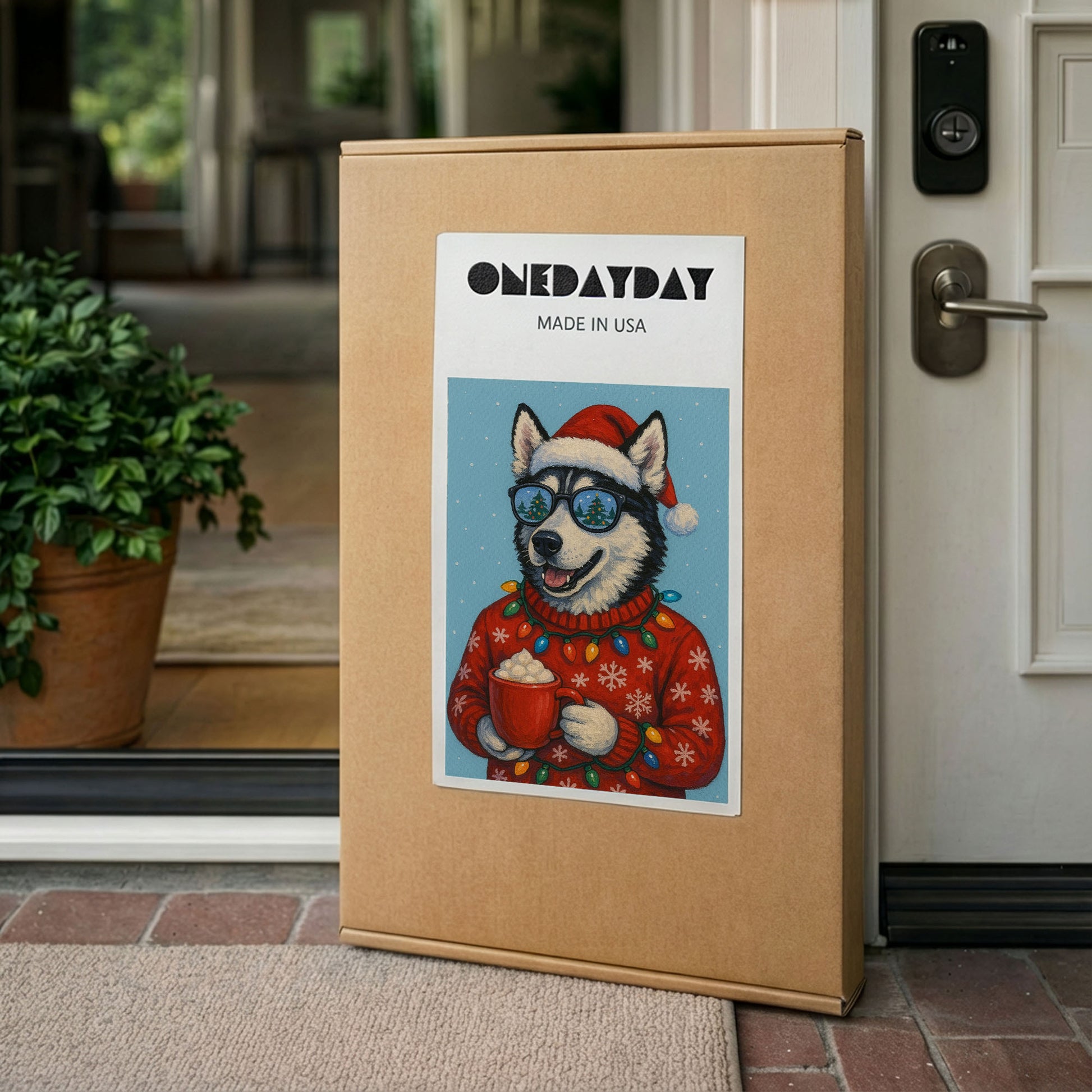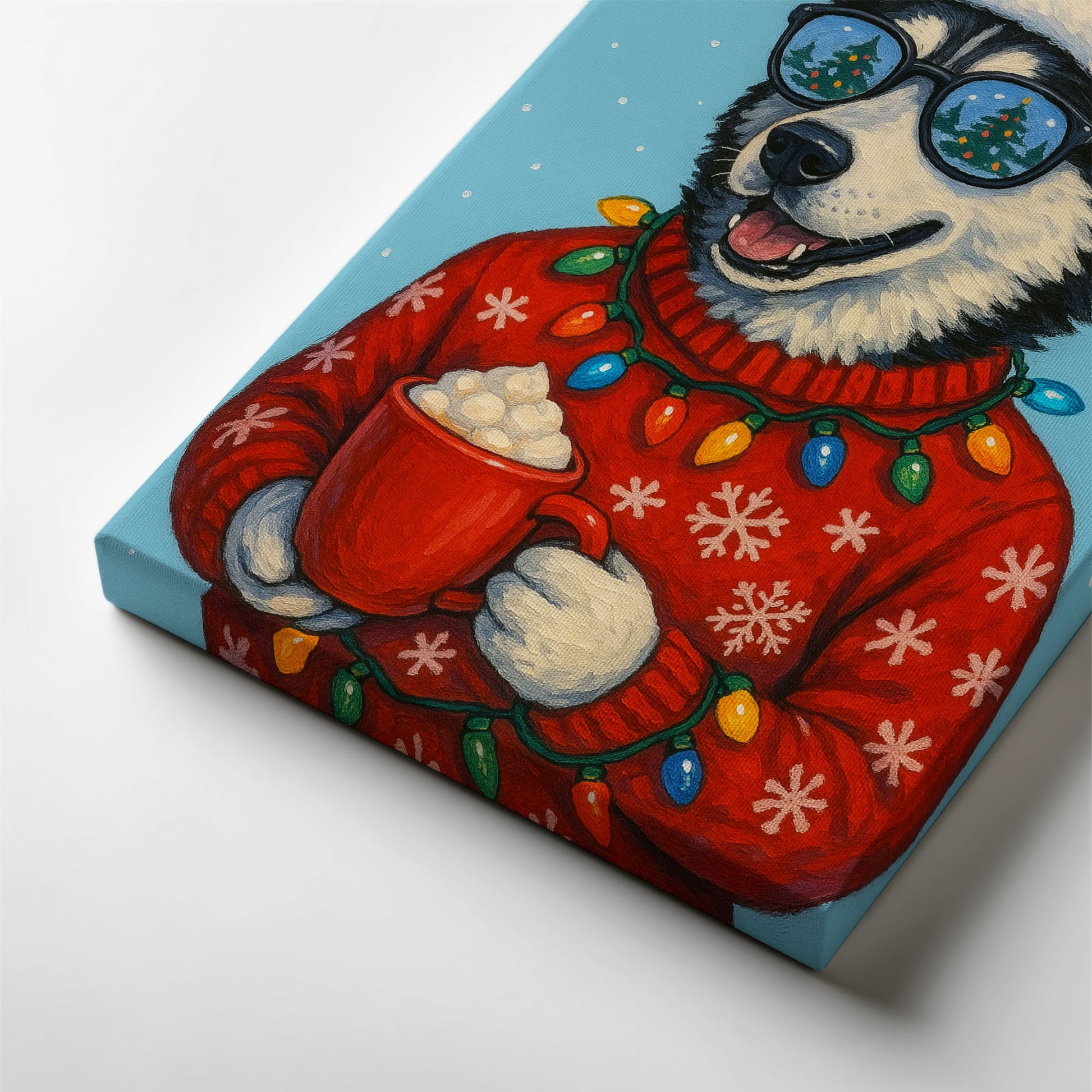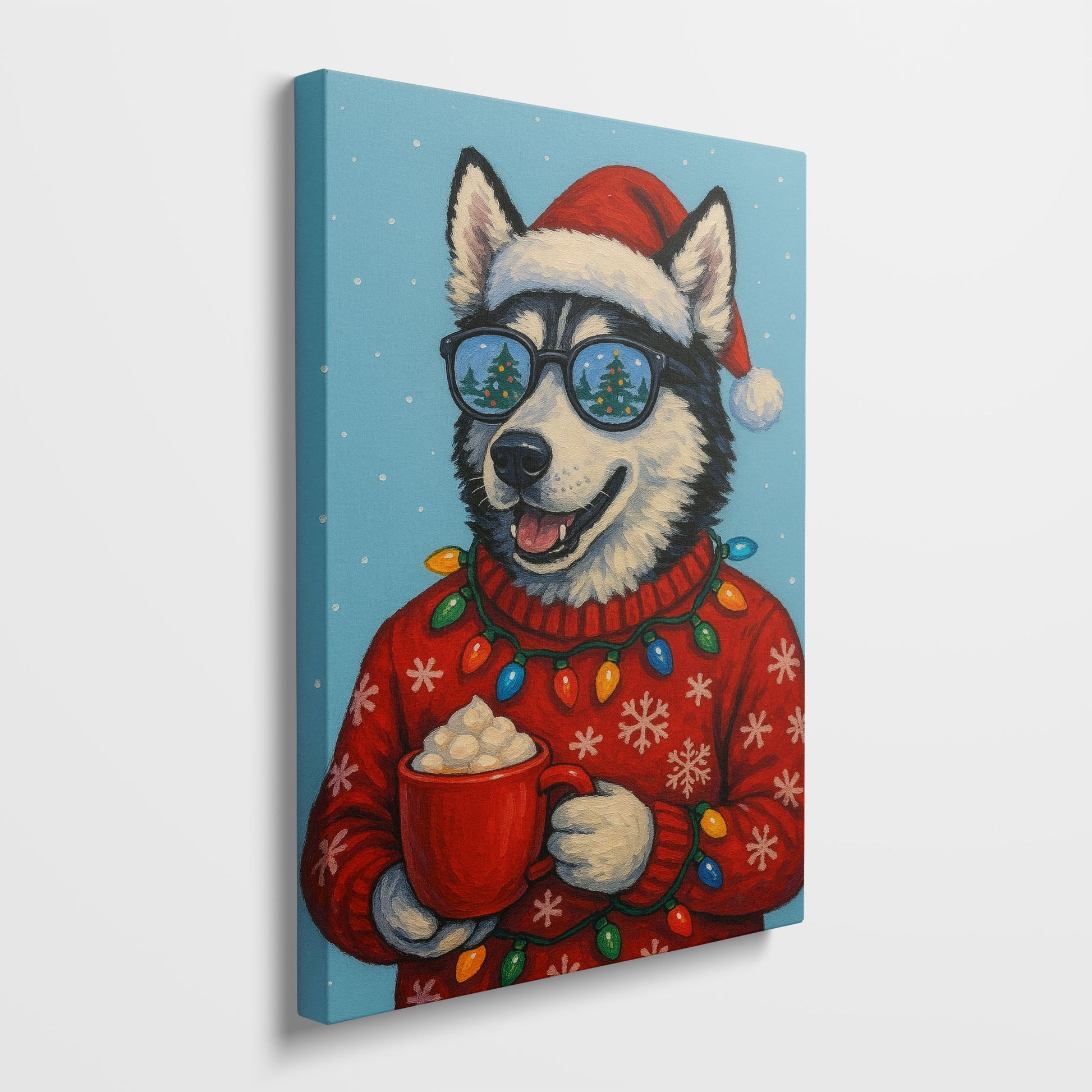 This cheerful husky portrait brings playful holiday energy to life. Wearing a Santa hat, festive lights, and holding a warm drink, the husky’s joyful expression instantly brightens the space.