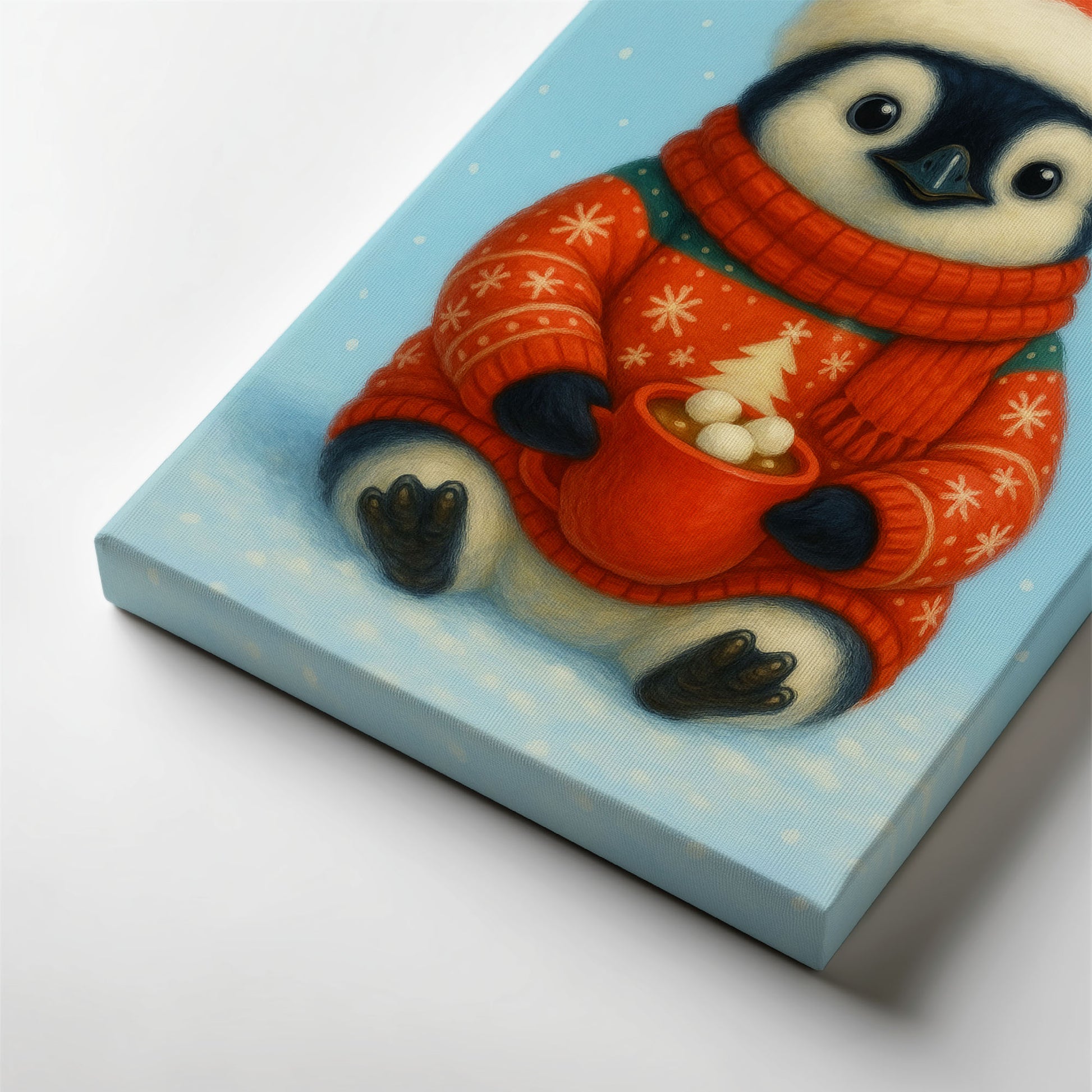 This adorable penguin portrait radiates warmth and comfort, featuring a bundled-up penguin holding a cup of hot cocoa in a snowy winter scene. The soft textures and gentle expressions create a heartwarming holiday atmosphere.