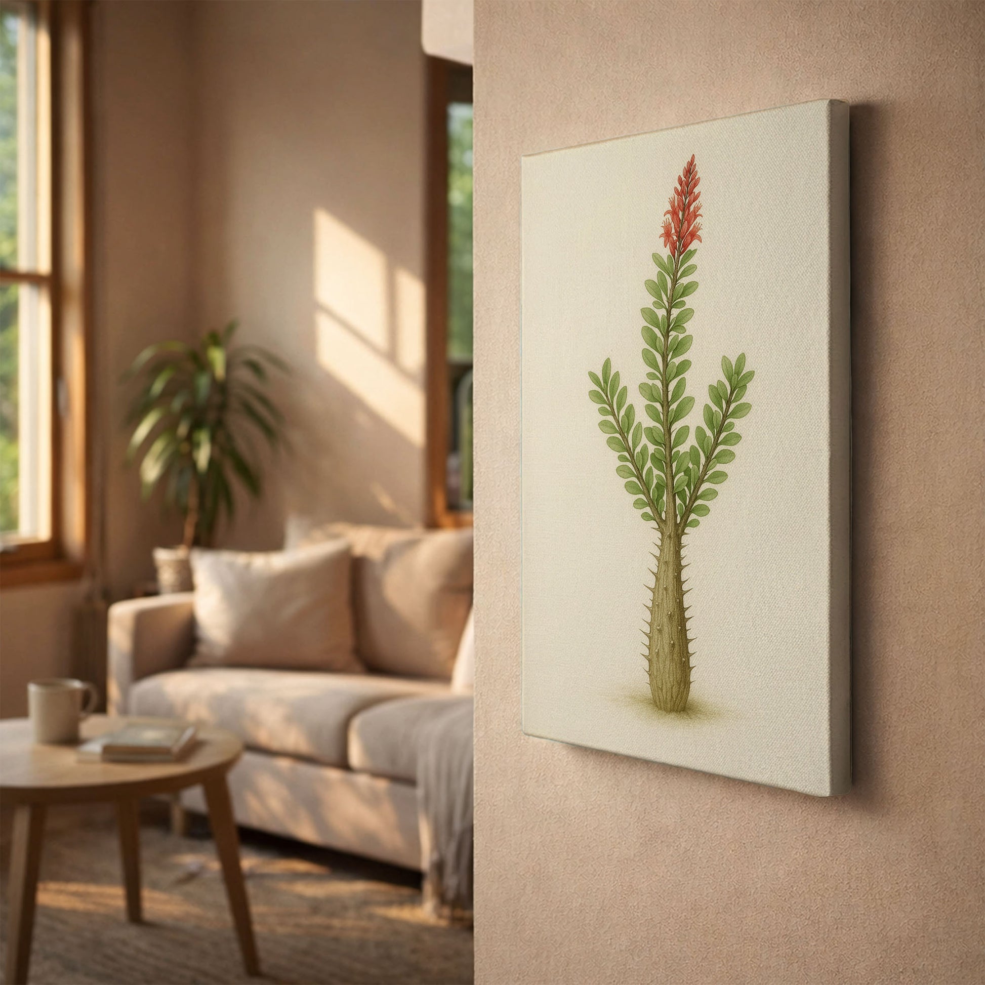 This artwork highlights Fouquieria splendens as a tall, vertical botanical form, crowned with a vivid red flower spike. The clean background emphasizes the plant’s slender proportions and rhythmic spines, creating a composition that feels architectural and refined.