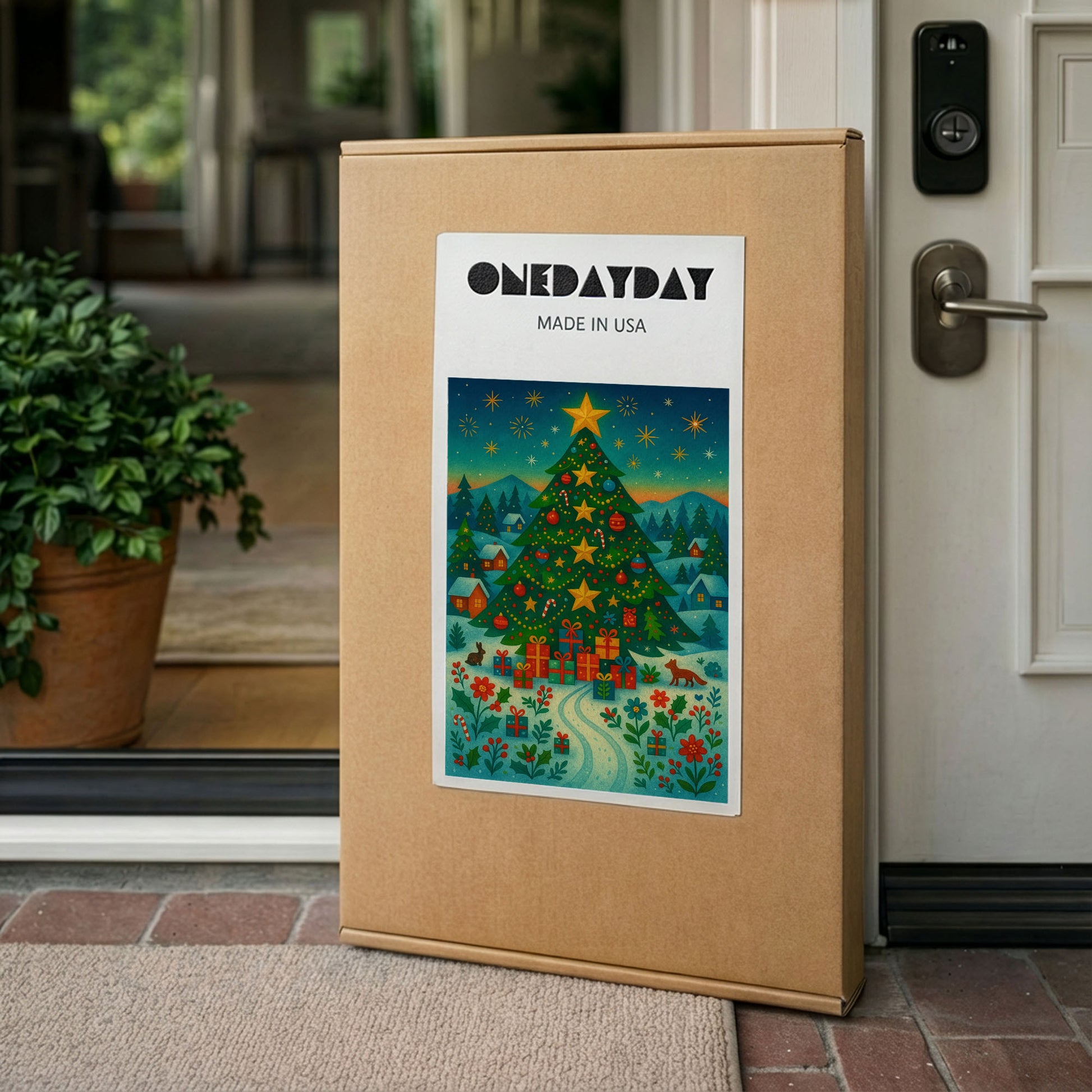A radiant holiday tree crowned with golden stars rises above a peaceful winter landscape. Warm tones and gentle details create a sense of celebration, comfort, and quiet joy.