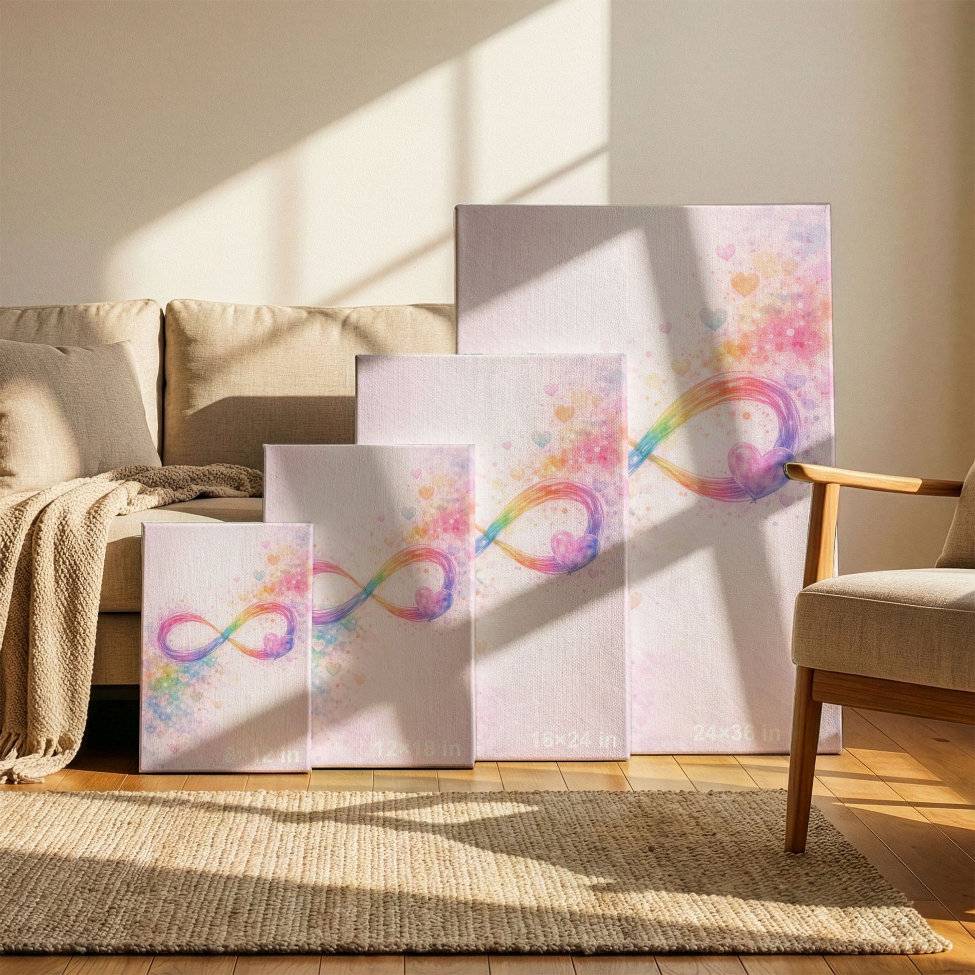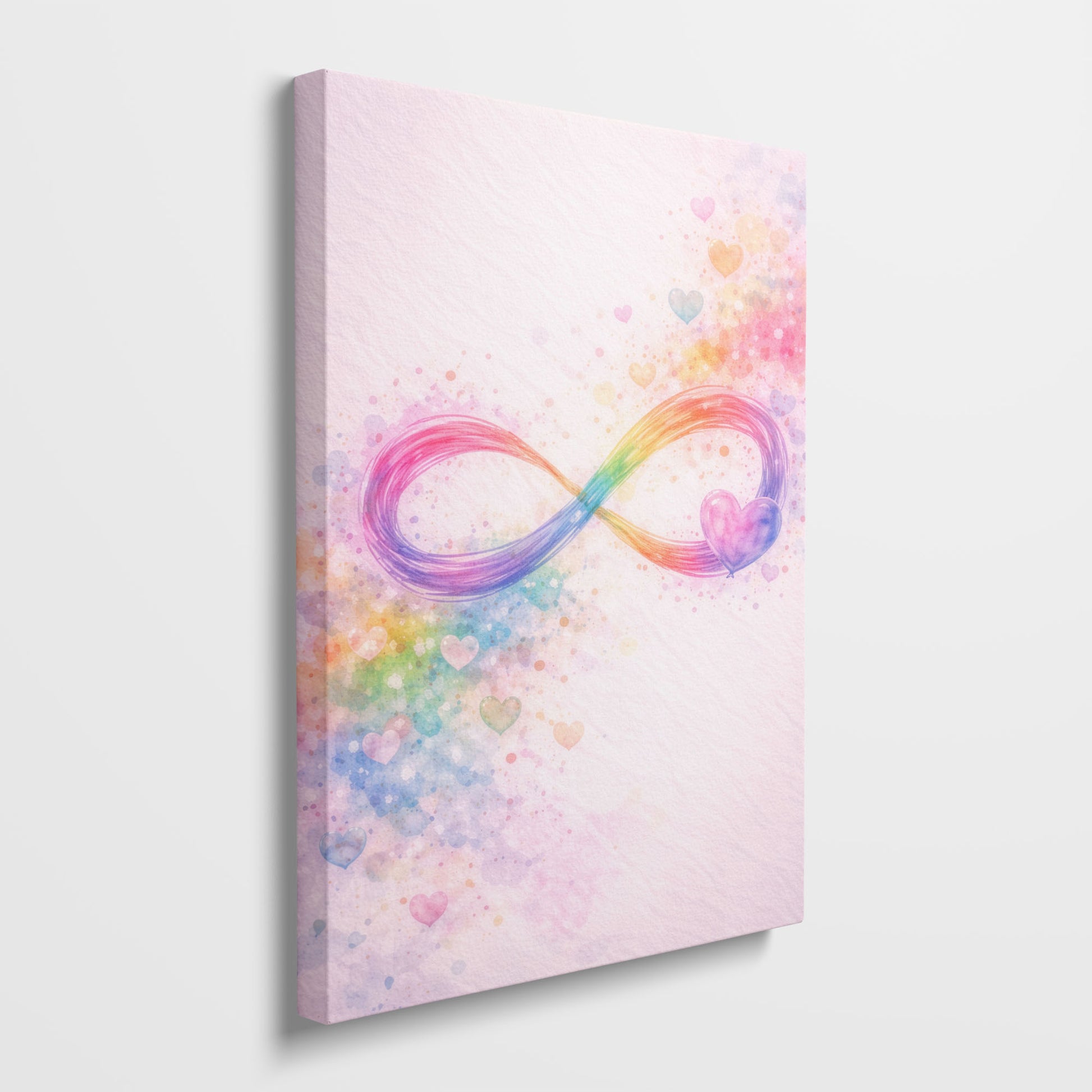 This minimalist canvas wall art features a flowing infinity symbol painted in soft rainbow tones, gently forming a heart at one end. The watercolor-like texture and airy background give the piece a light, uplifting presence.