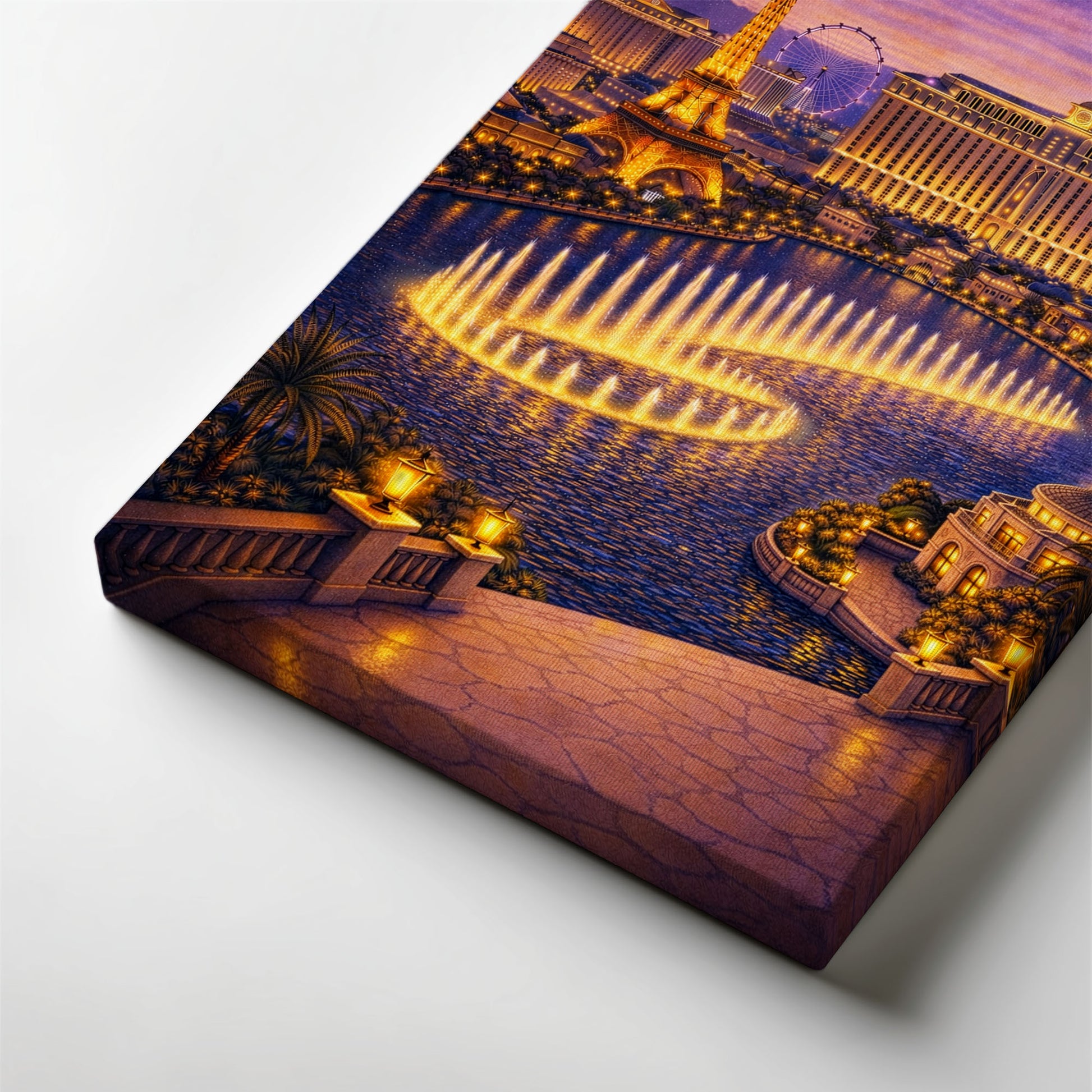 Golden fountains rise from deep blue water, iconic structures glow against the night sky, and the city pulses with spectacle and movement.