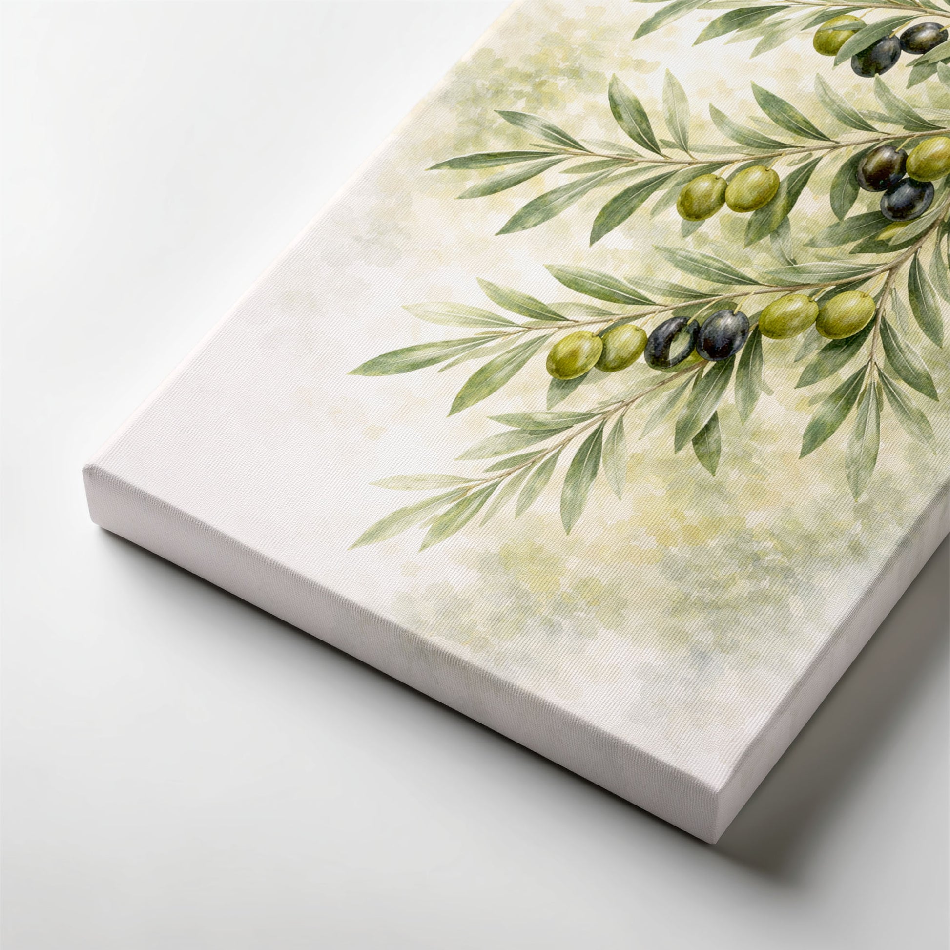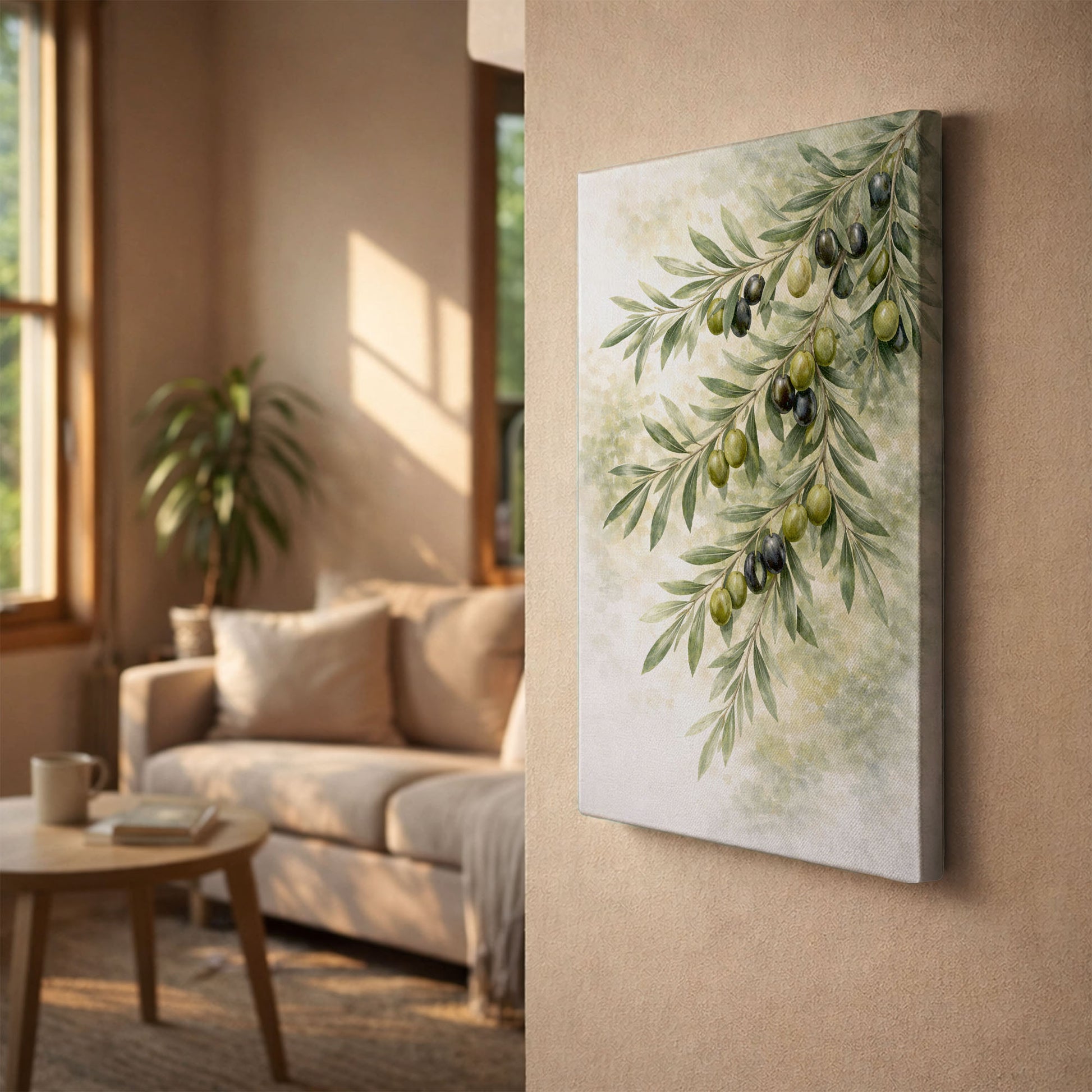 This olive branch illustration showcases delicate leaves and ripening olives painted in a soft, natural palette. Inspired by Mediterranean landscapes, the composition feels balanced and organic, with gentle movement and refined botanical detail.