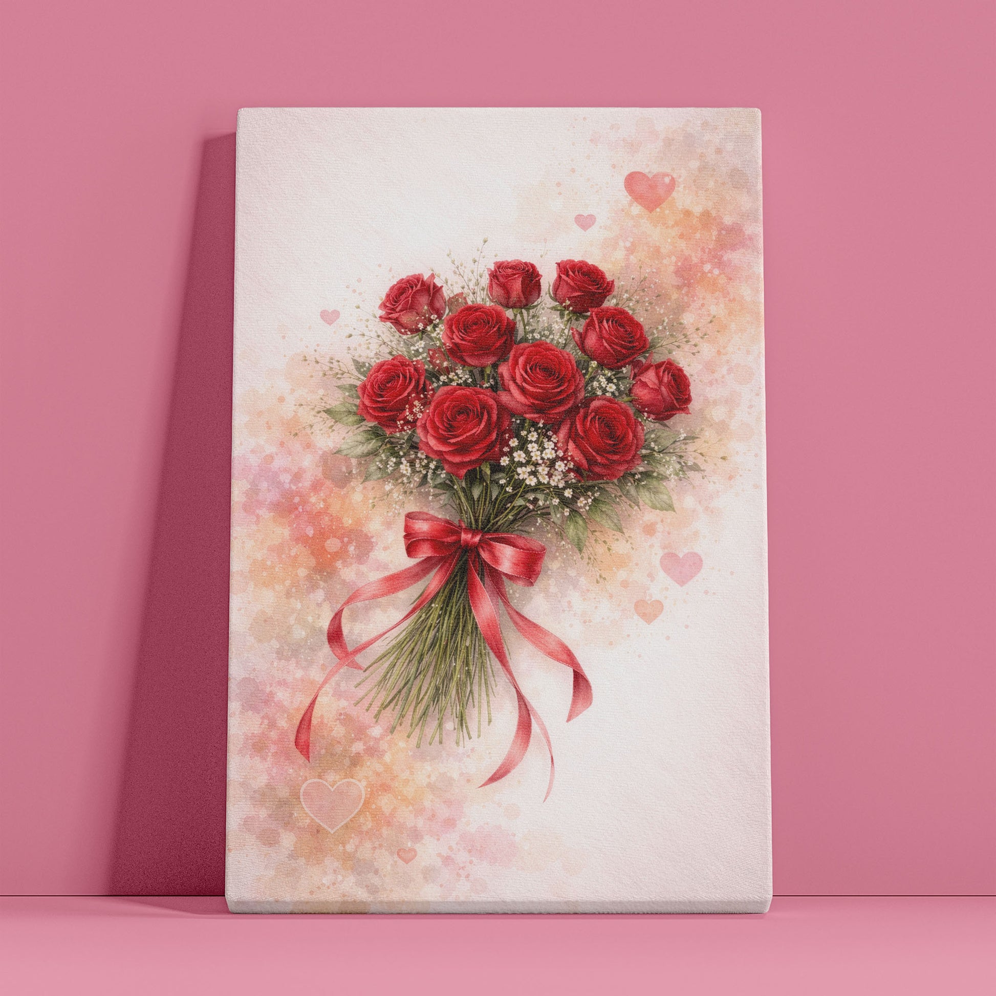 This romantic canvas wall art features a lush bouquet of deep red roses, elegantly tied with a flowing ribbon and set against a soft pastel background filled with subtle heart accents. Rich in color and emotion, the composition symbolizes passion, devotion, and timeless love.