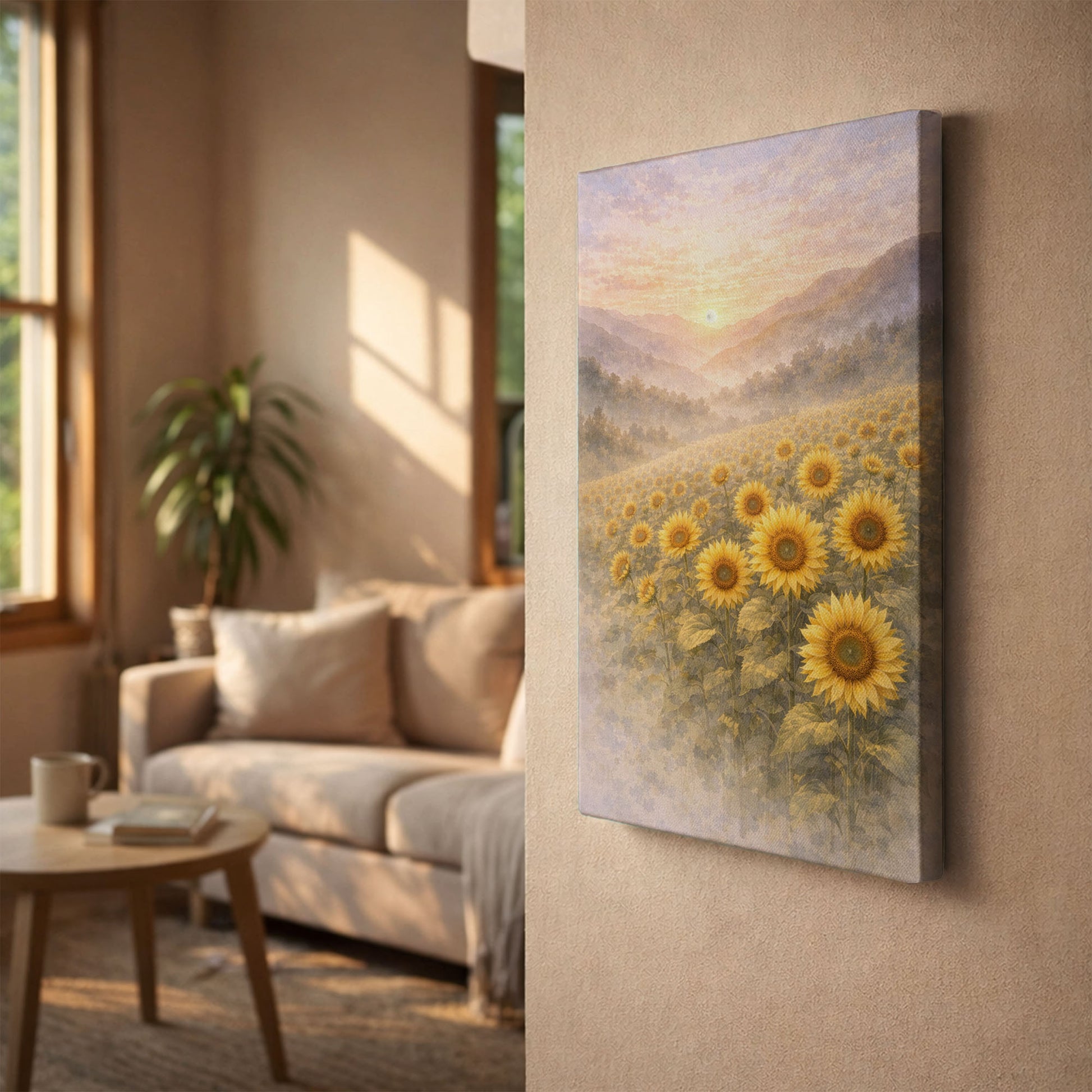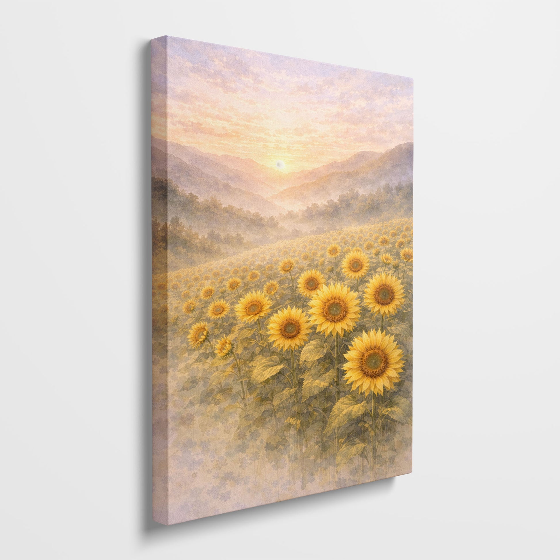 This sunflower field artwork depicts a vast golden landscape bathed in soft morning light, with rolling hills and a glowing sunrise in the distance. Rows of sunflowers gently lead the eye into the scene, creating depth, calm movement, and a sense of peaceful openness.