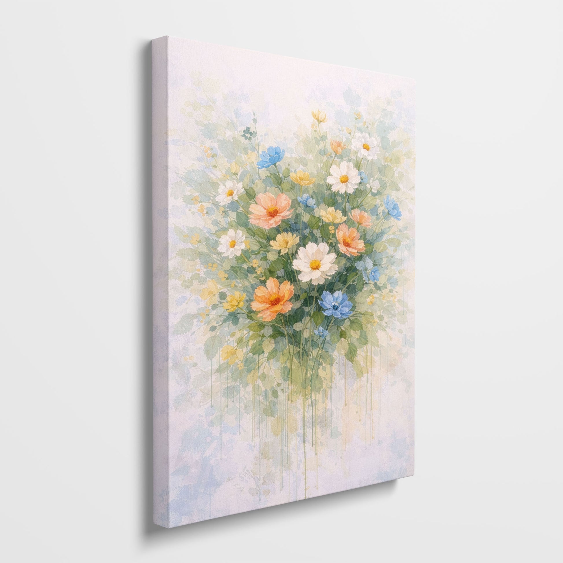 Inspired by a blooming meadow, this abstract floral artwork features a lively mix of pastel flowers scattered among soft greenery. The layered composition creates depth while preserving an airy, open feeling.